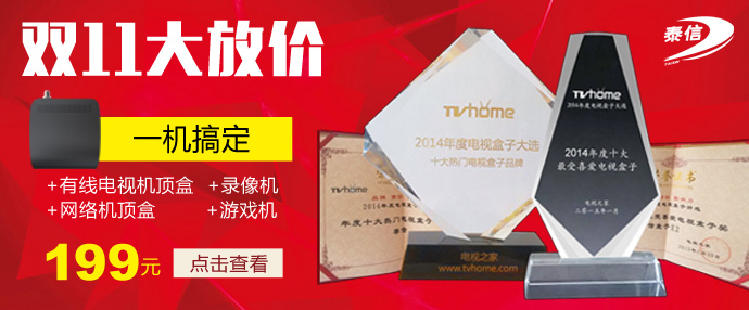 技术创新赢得产品领先!泰信盒子是国内首款集广电有线电视、网络电视、录像机、游戏机于一体的全国市场化销售的融合型智能机顶盒。泰信盒子X2荣膺2014年度十大最受喜爱的电视盒子及品牌。爆款好机惠迎国庆,购机不必等到双11!心动的小伙伴千万不要错过哦!